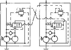 圖5為具有功率綜合的壓力傳感卸載回路,它由兩組略加變化的壓力傳感卸載泵組成,兩組泵由同一原動(dòng)機(jī)驅(qū)動(dòng),每臺(tái)泵接受另一卸載泵的導(dǎo)控卸載信號(hào)。此種傳感方式稱之為交互傳感,它可使一組泵在高壓下工作而另一組泵在大流量下工作。兩只溢流閥可按每個(gè)回路特殊的壓力調(diào)整,以使一臺(tái)或兩臺(tái)泵卸載。此方案減少了功率需求,故可采用小容量?jī)r(jià)廉原動(dòng)機(jī)。