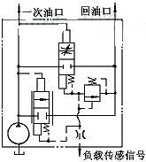 圖6所示為負(fù)載傳感卸載回路。當(dāng)主控閥的控制腔(下腔)無(wú)負(fù)載傳感信號(hào)時(shí),泵的所有流量經(jīng)閥1、閥2排回油箱;當(dāng)給此控制閥施加負(fù)載傳感信號(hào)時(shí),泵向回路供液;當(dāng)泵的輸出壓力超過負(fù)載傳感閥的壓力預(yù)定值時(shí),泵僅向回路提供工作流量,而多余流量經(jīng)閥2的節(jié)流位置旁通回油箱。